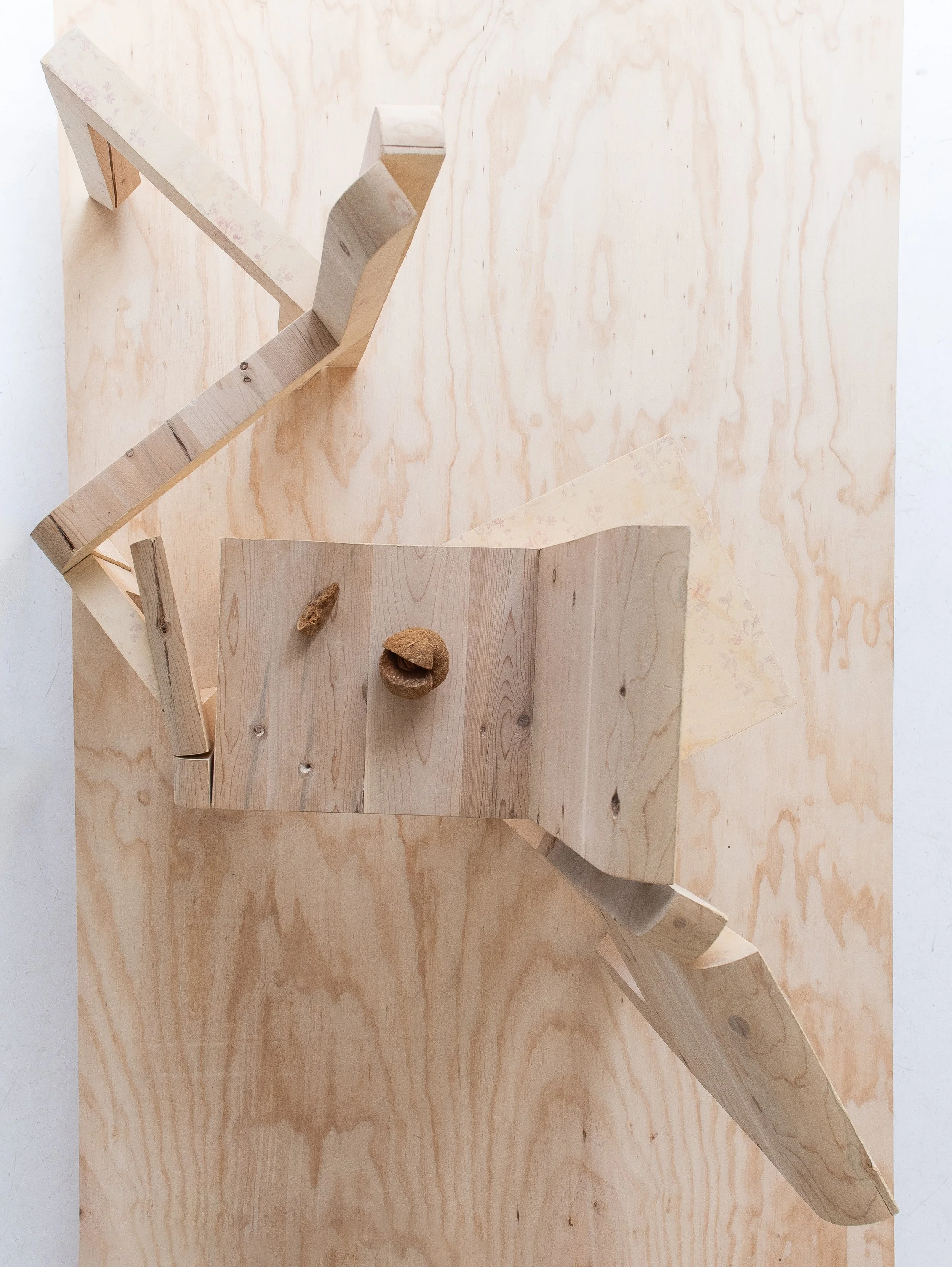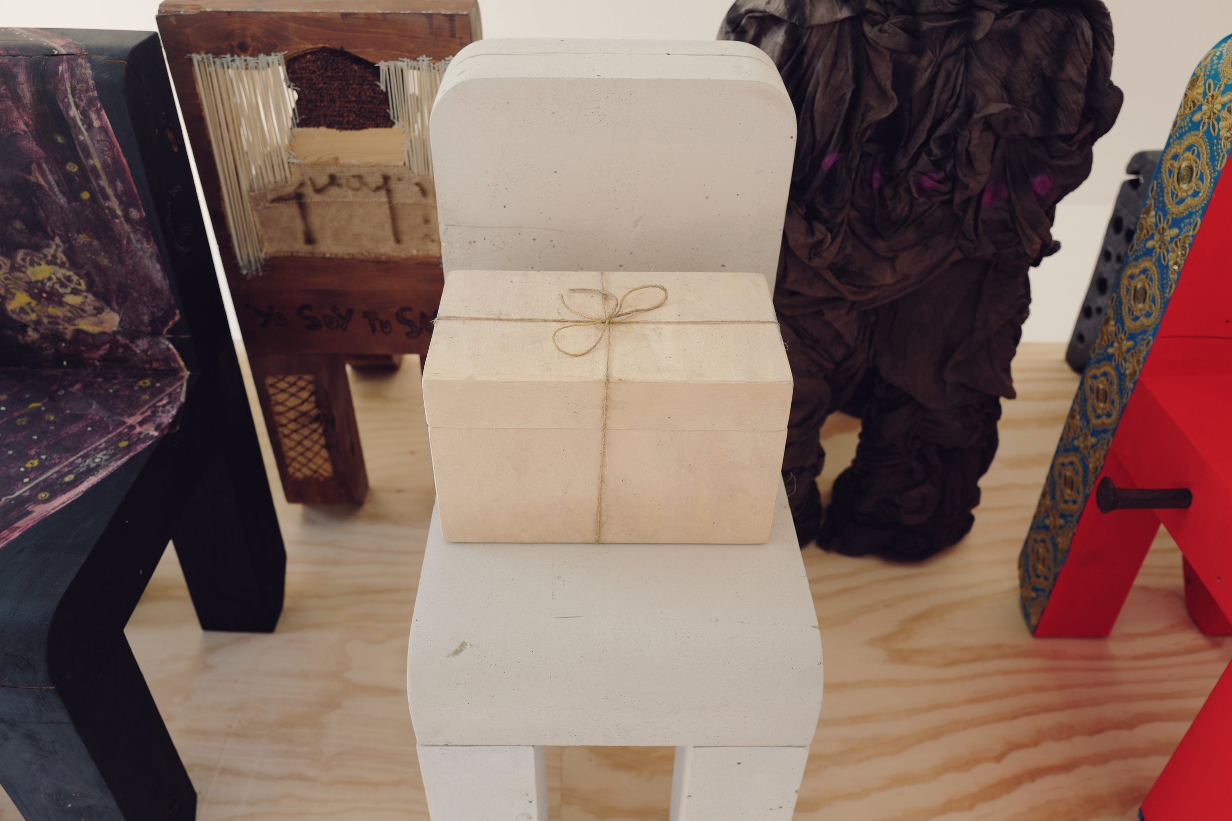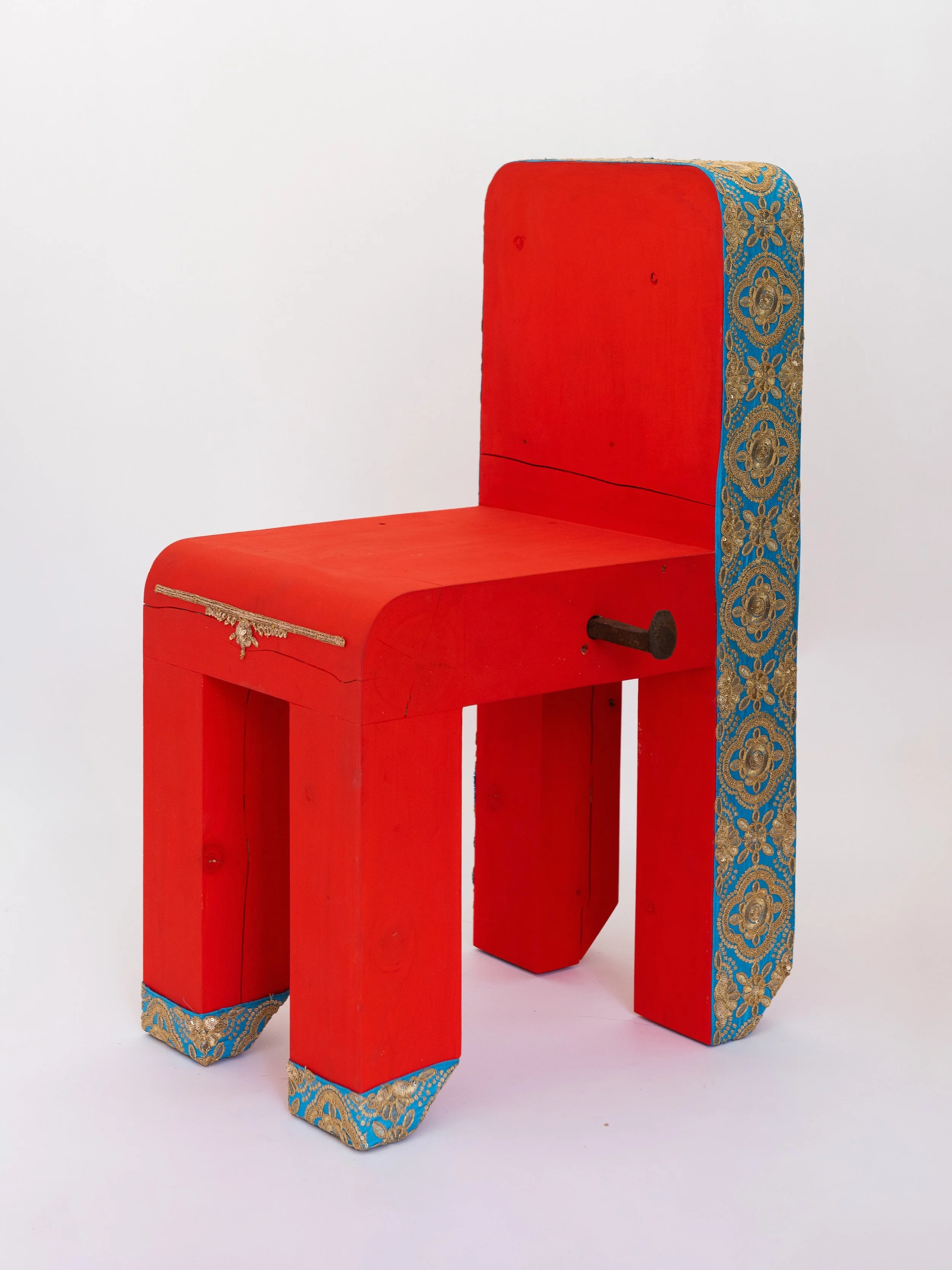 Each artist was given a white cedar chair designed and constructed by Theju Nimmagadda, with a prompt to make it their own. In adorning and reimagining a utilitarian form, the artists challenge the supposed islands of fine and decorative arts. In some cases art gently bends towards function, in others, transformation is so total that the lineage of the original object is almost lost.